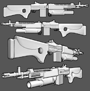 - The earlier designs of the Carbine made it resemble the LR-300, complete with the M203 grenade launcher and the wooden stock/grip seen in today's Folsom Carbine. However this was changed by concept artist Carlo Arellano, who thought that both the gun didn't look right alongside the early design of the Hybrid with the duck-like face.